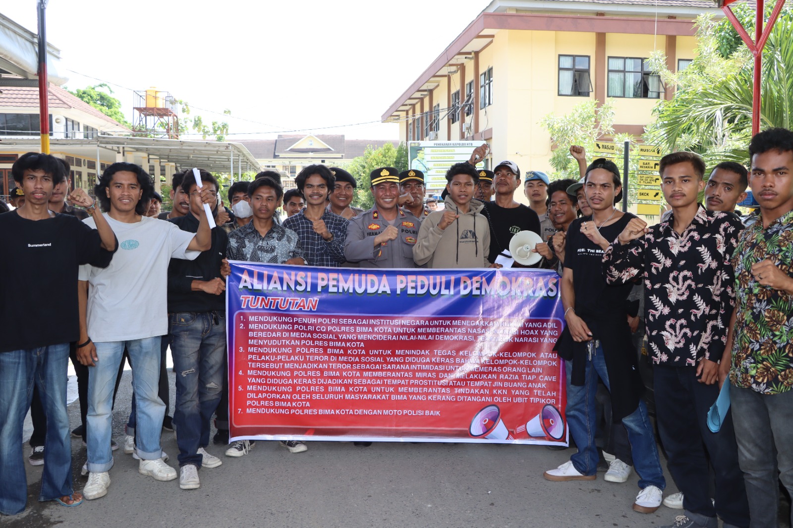 Pada hari Jumat, 10 Oktober 2025, sekitar pukul 09.30 WITA, Aliansi Pemuda Peduli Demokrasi menggelar aksi unjuk rasa di halaman Mapolres Bima Kota. Aksi yang diikuti sekitar 25 orang massa ini dipimpin oleh Kurniawan Putra selaku koordinator lapangan.