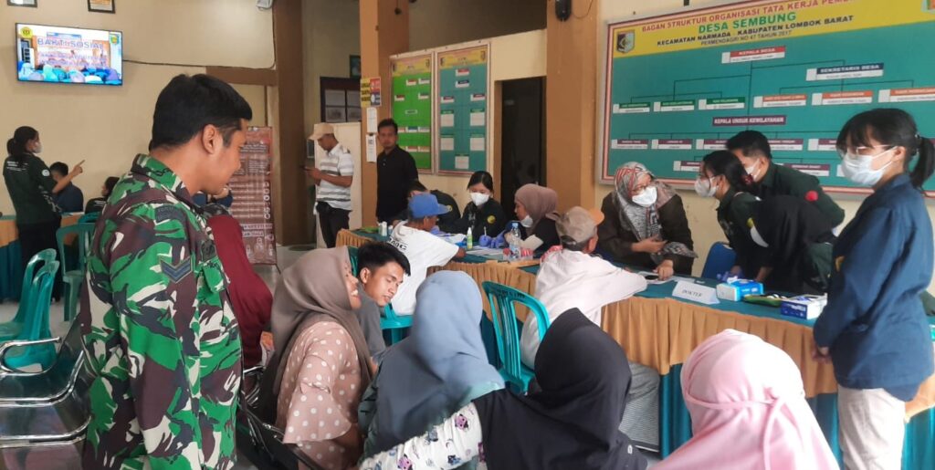 Lombok Barat, NTB – Kepedulian terhadap kesehatan masyarakat kembali ditunjukkan oleh TNI bersama kalangan akademisi. Bintara Pembina Desa (Babinsa) Sembung, Komando Rayon Militer (Koramil) 1606-08/Narmada, melaksanakan pendampingan kegiatan pemeriksaan kesehatan gratis yang digelar oleh Mahasiswa Fakultas Kedokteran dan Ilmu Kesehatan Universitas Mataram (Unram) di Kantor Desa Sembung, Kecamatan Narmada, Lombok Barat, Senin (13/10/2025).