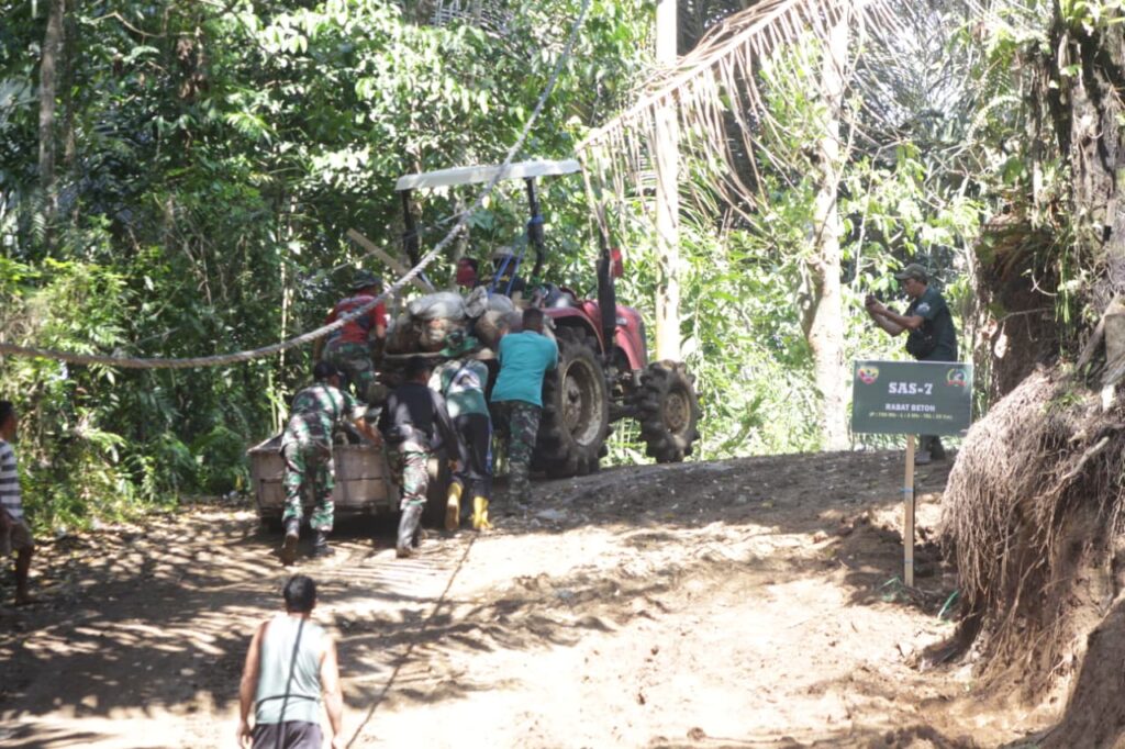 Yang menarik, proses pengangkutan material kali ini dilakukan menggunakan traktor yang dimodifikasi menjadi alat angkut sederhana, hasil kreativitas warga setempat. Alat ini menjadi solusi efektif untuk mempercepat pendistribusian material ke titik sasaran yang medannya cukup menantang.