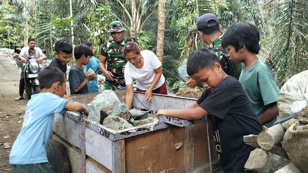 Lombok Barat, NTB – Suasana siang di Dusun Sayang, Desa Giri Madia, Kecamatan Lingsar, Lombok Barat, tampak berbeda. Beberapa anak terlihat antusias menurunkan batu dari traktor modifikasi didampingi orang tuanya. Mereka dengan penuh semangat ikut membantu anggota Satuan Tugas (Satgas) TNI Manunggal Membangun Desa (TMMD) ke-126 Komando Distrik Militer (Kodim) 1606/Mataram yang tengah melakukan pengerjaan penaludan dan membuka akses jalan penghubung di desa mereka, Kamis (16/10/2025).