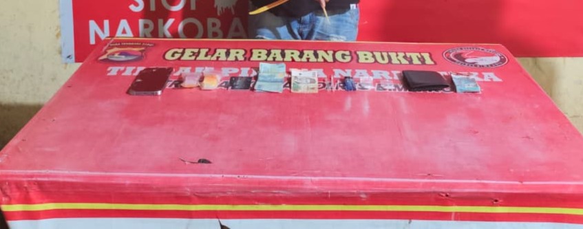 Dari hasil penggeledahan yang disaksikan oleh saksi umum, petugas berhasil mengamankan sejumlah barang bukti berupa 2 poket sabu ukuran kecil dengan berat bruto 2,33 gram, 200 buah klip kosong, 1 buah ATM Bank Mandiri, 1 buah pipet kaca, 2 buah pipet plastic, 1 unit handphone Samsung A55G, Uang tunai Rp555.000 (11 lembar pecahan Rp50.000 dan 1 lembar pecahan Rp5.000)